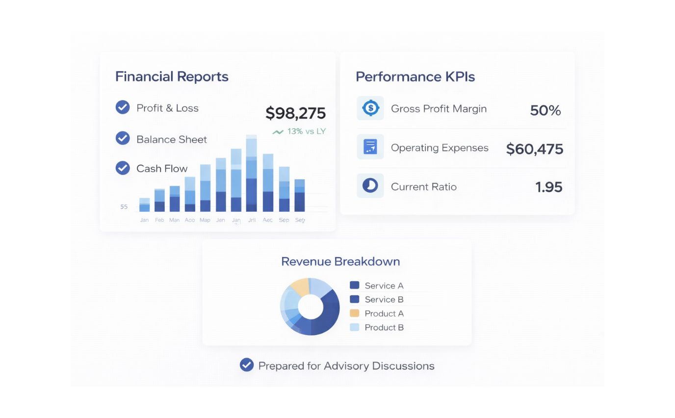 Preparation and review of financial statements, management reports, KPIs, and performance summaries — including profit and loss, balance sheet, and cash flow reporting for ongoing clarity.